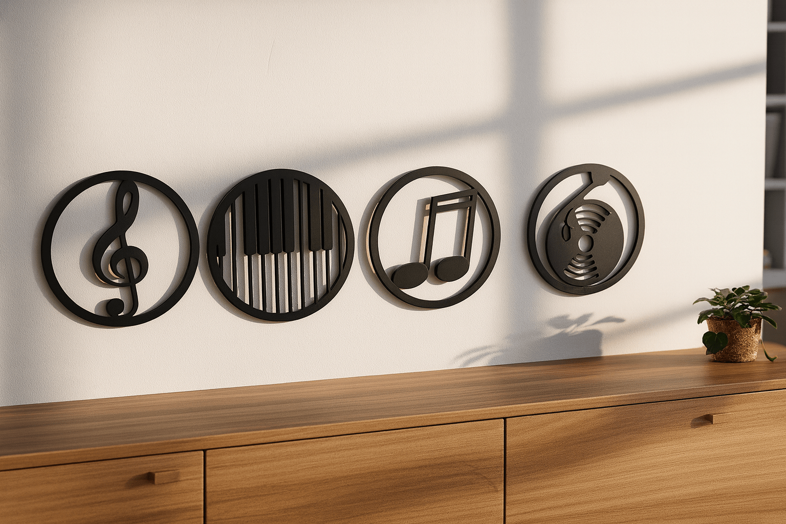 Este set incluye cuatro diseños circulares con símbolos musicales representativos: